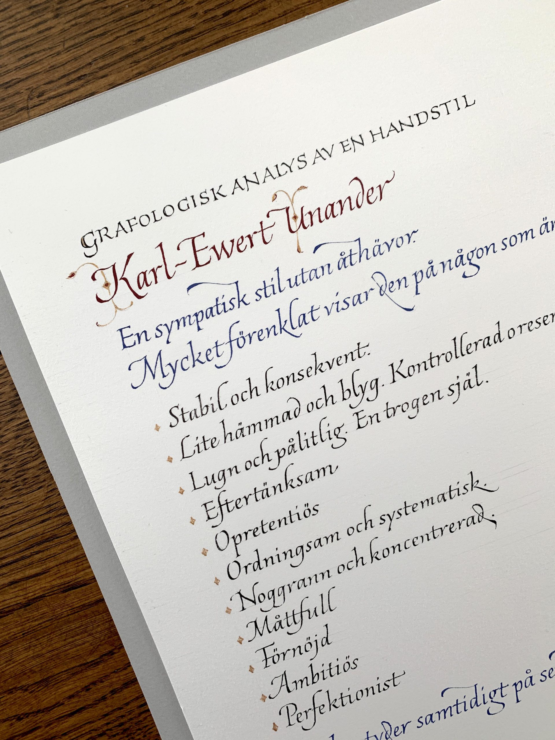 Grafologisk analys av en handstil. Personlig text, gåva vid födelsedag. 20 x 29 cm. Beställningsarbete...